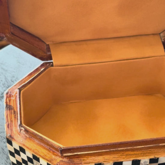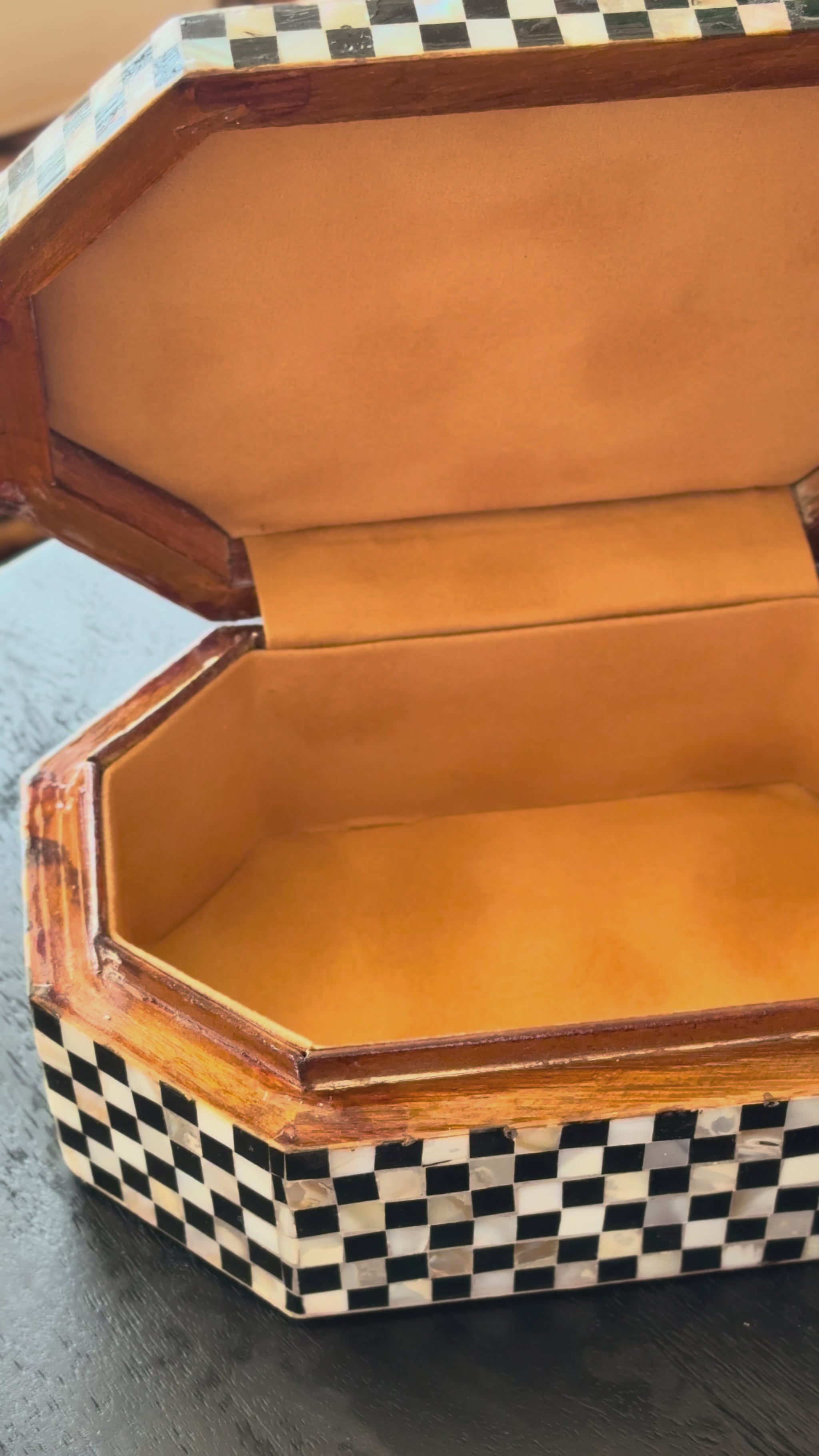 Handmade octagonal jewelry box featuring striking black and white checkerboard mother-of-pearl mosaic. Bold geometric pattern creates a timeless chess-inspired design. Velvet-lined interior perfect for jewelry storage.