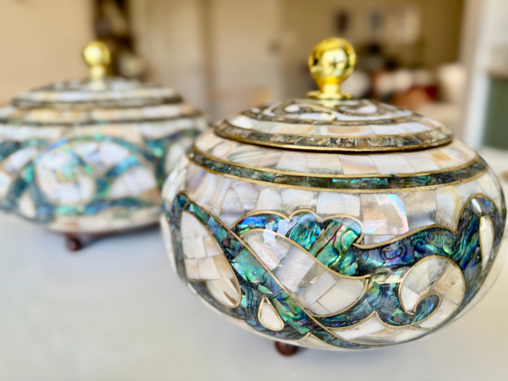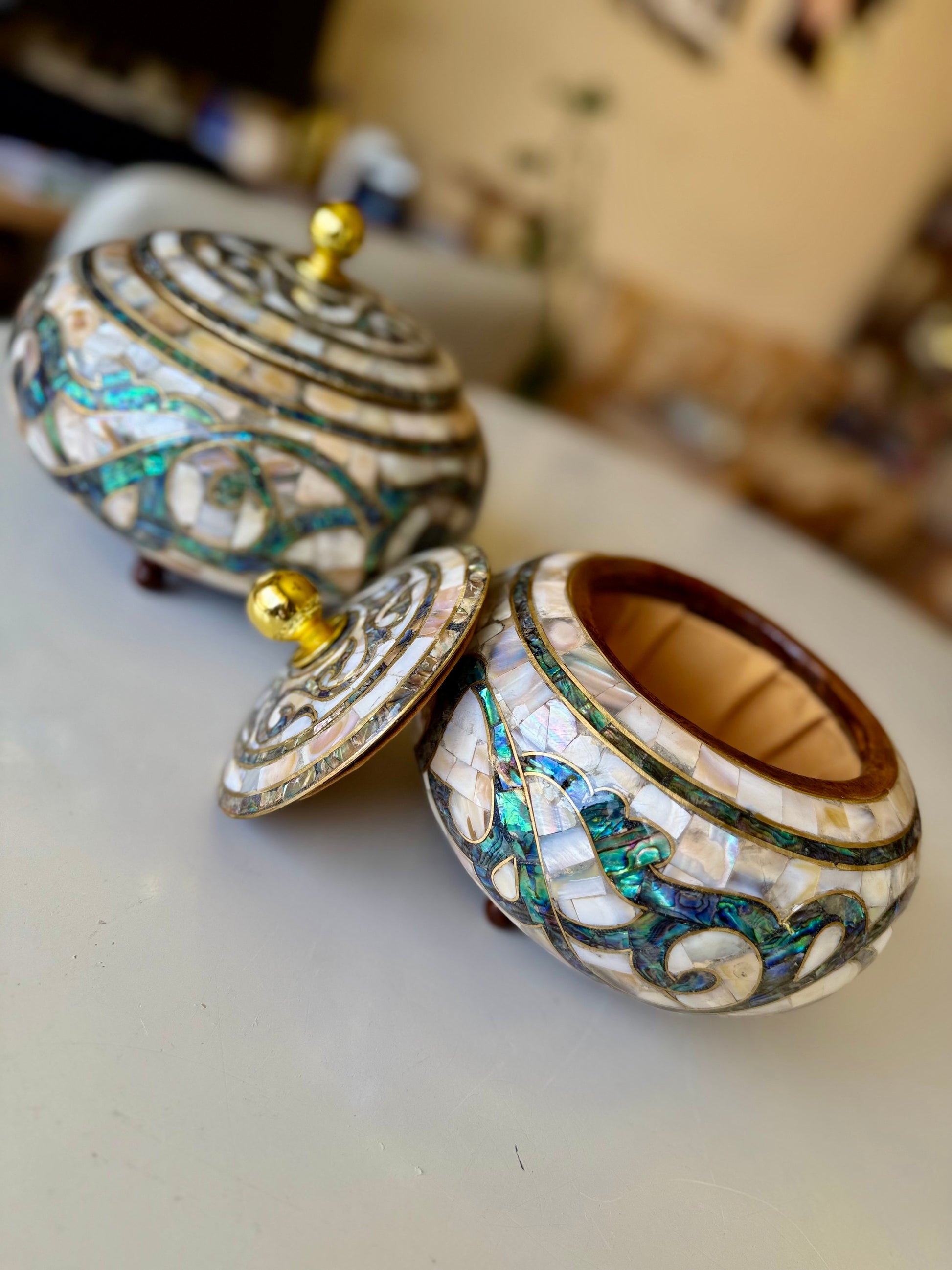The scrollwork pattern and rounded shape give these a more classical, urn-like elegance compared to your geometric pieces. The iridescent green abalone creates stunning contrast with the cream mother-of-pearl base.