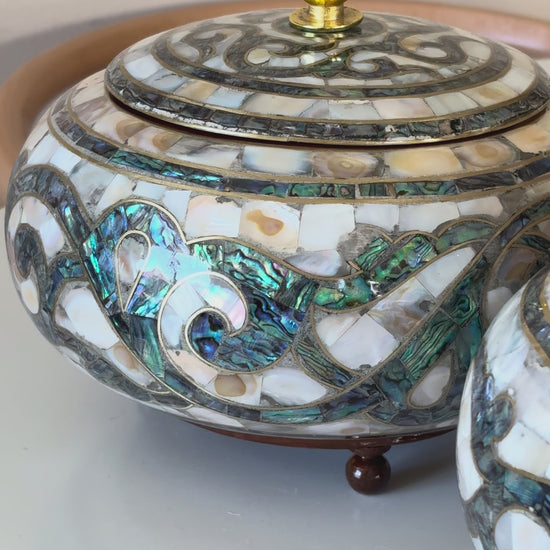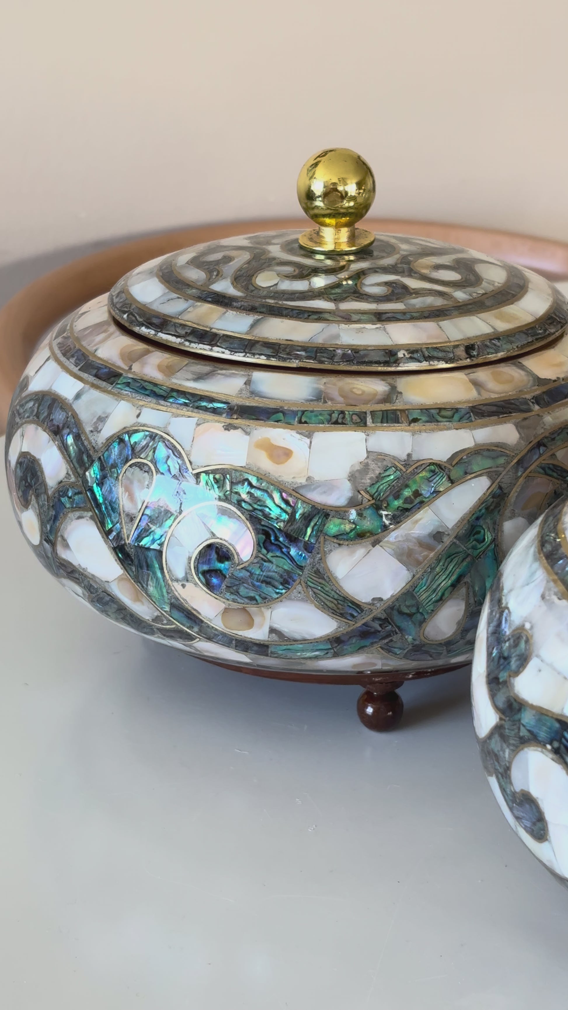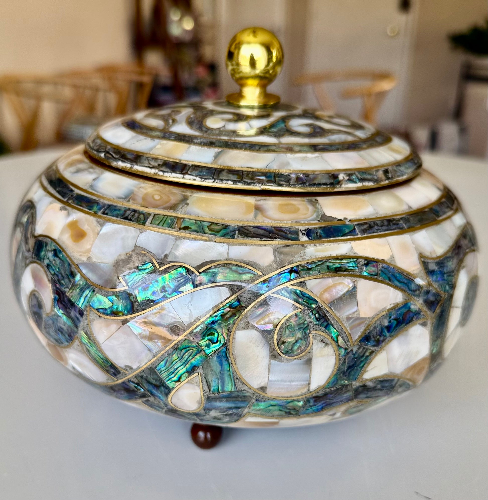 Handmade decorative bowl featuring intricate abalone and mother-of-pearl mosaic inlay with flowing scroll patterns. Brass finial and velvet-lined interior. Perfect for jewelry storage or as an elegant centerpiece.