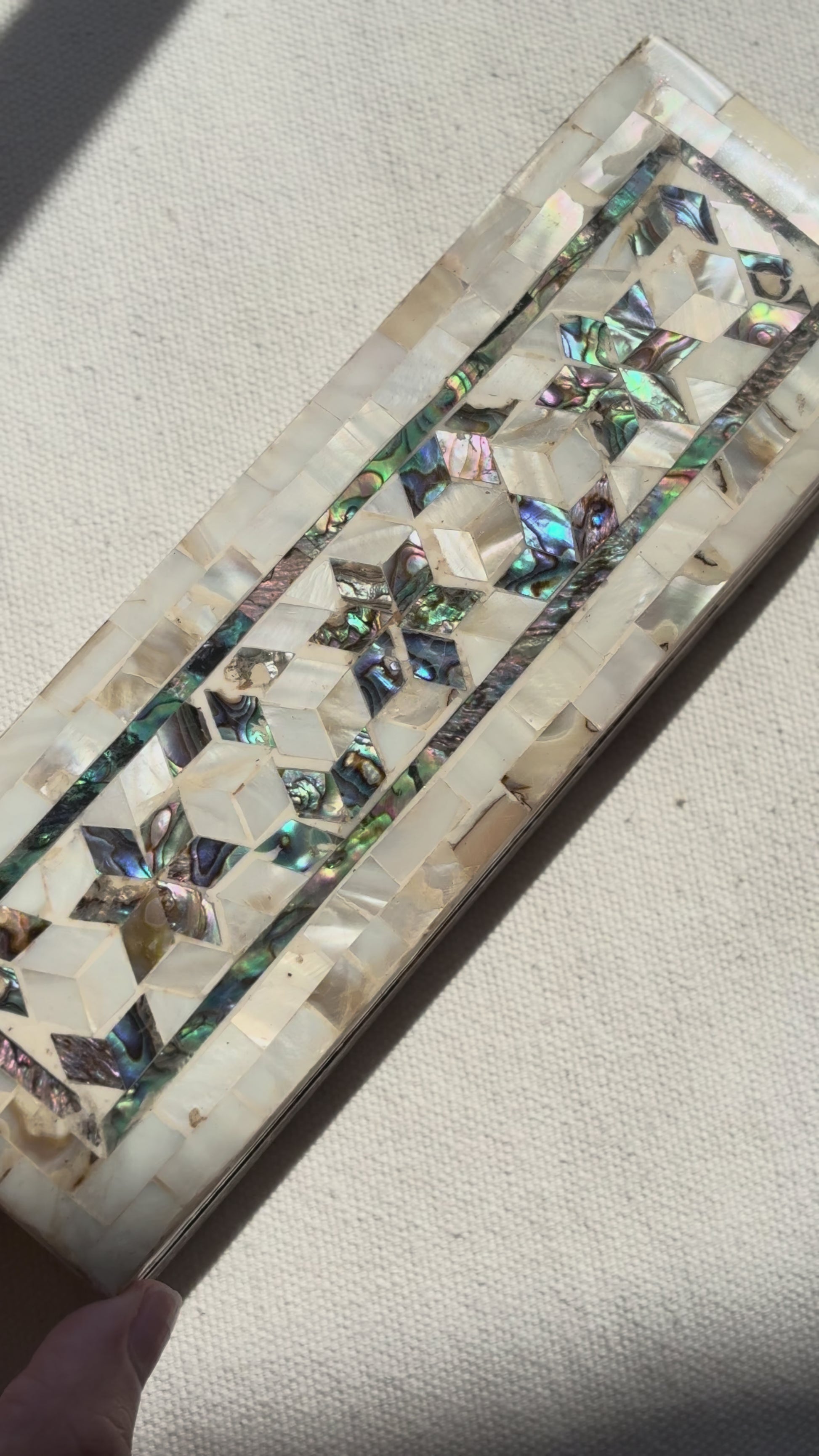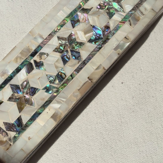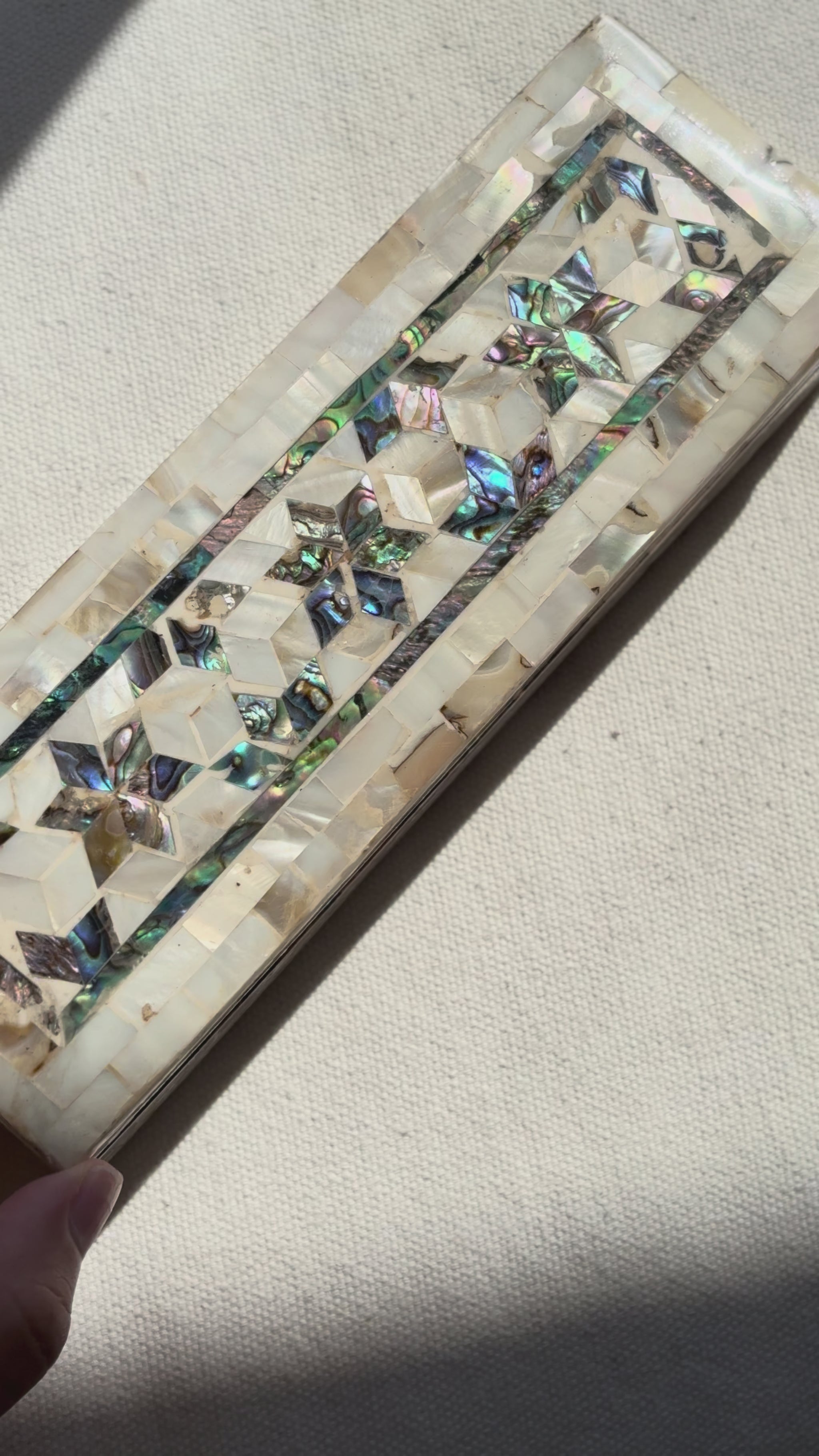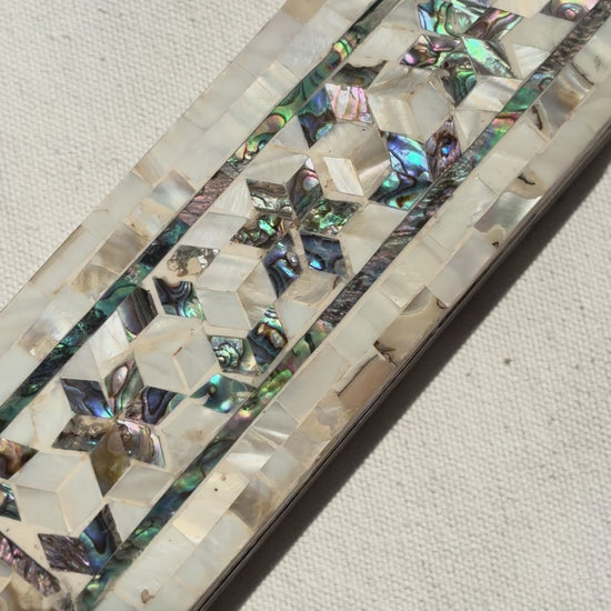 An opulent masterpiece of artisanal craftsmanship, this lidded vessel showcases intricate scrollwork motifs rendered in lustrous abalone shell and pristine mother-of-pearl, elegantly framed with golden accents. Each curve and flourish is meticulously hand-inlaid by skilled artisans, creating a breathtaking interplay of iridescent blues, greens, and creamy pearls that dance with light. Perfect as a jewelry casket, precious keepsake box, or stunning decorative centerpiece, this treasure vessel transforms any space with its timeless elegance and Old World charm. The substantial weight and smooth lacquered finish speak to generations of traditional craftsmanship, making this not merely a storage piece, but a cherished heirloom that celebrates the marriage of natural beauty and human artistry.